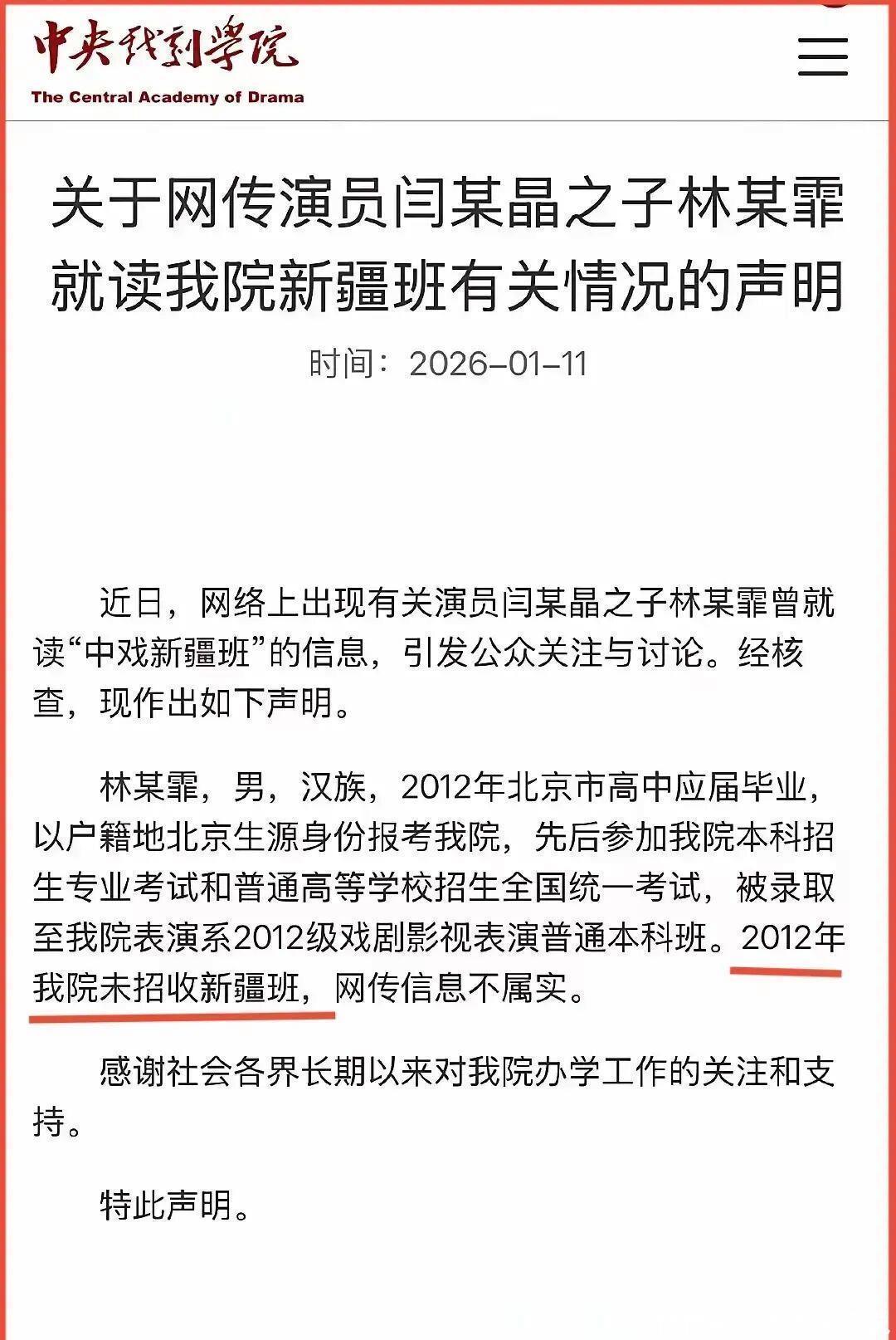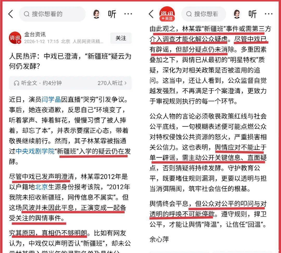 人民网评论就一针见血地指出,“究其原因,真相仍不够明朗”,“尽管中戏已有辟谣,但部分疑点仍未消除”。如何做到有说服力?如果中戏看了人民网评论,就知道应该“公示林某霏入学当年的录取名单及具体分数”,不这样做,根本无法取信于人民群众。为什么?因为林某霏的妈妈闫学晶自己在直播间里亲口说过她儿子报考新疆班,年新疆名学生唯独两个汉族学生之一查不到姓名,这太巧合了!还有一点,面对学籍争议,林某霏曾在接受采访时称“网传部分言论不实”,却始终回避报考资格、户籍学籍匹配度等核心问题,这种“绕开重点”的回应反而加剧了公众疑虑。有一个成语叫“欲盖弥彰”,我觉得涉事人员与涉事单位,应该好好想一想这是什么意思。绕来绕去,避重就轻,顾左右而言他,这实际上都是等于默认一样。